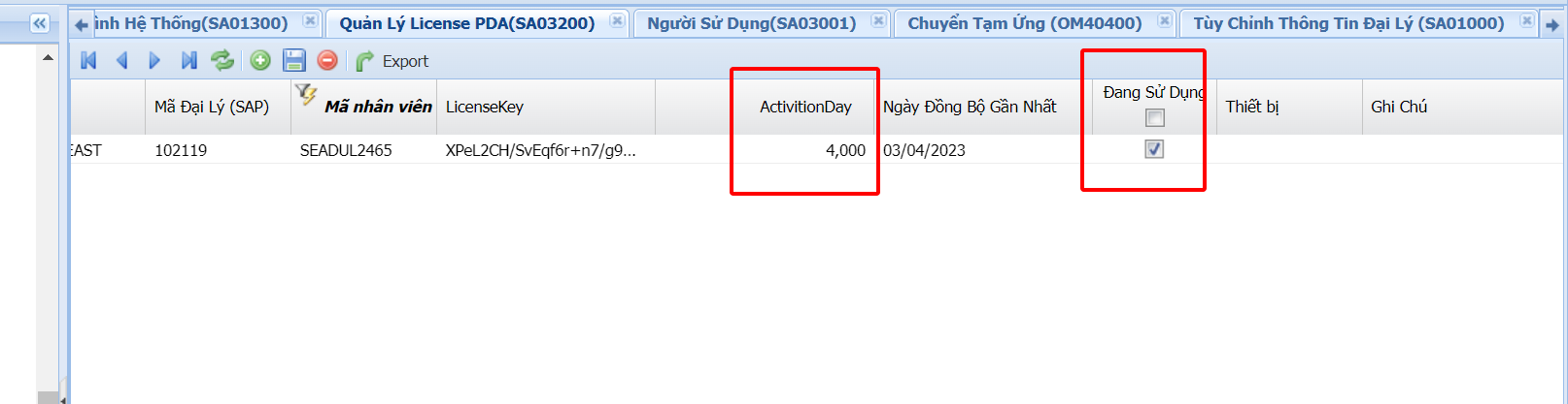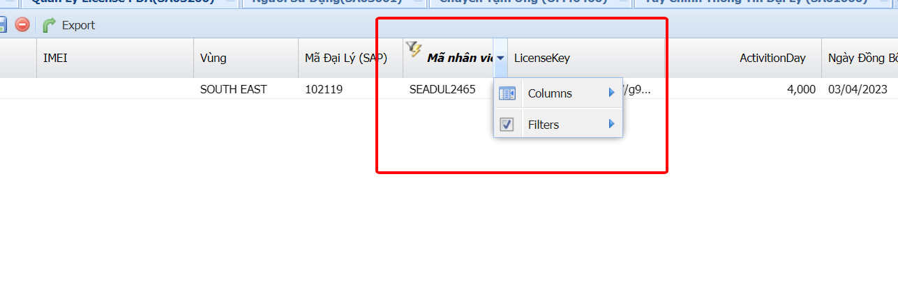 B1: Vào màn hình Quản lí license PDA, filter mã NVBH